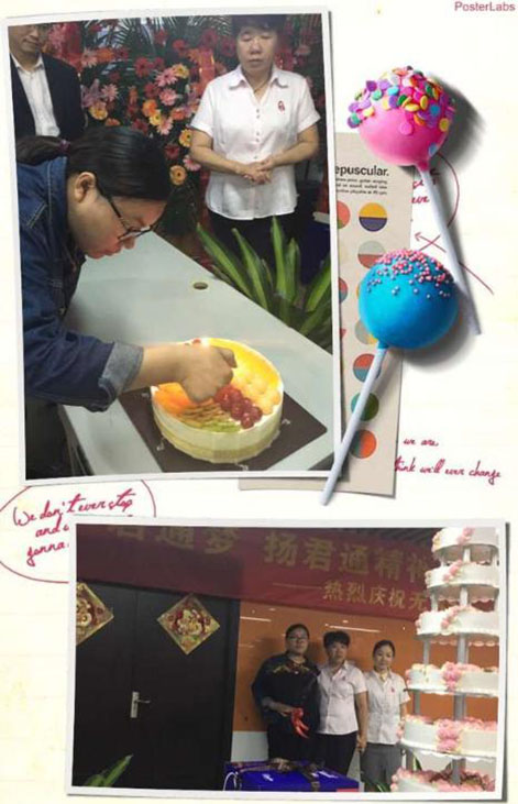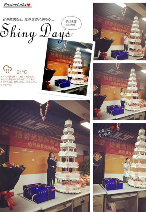 说出对尹总、对公司的各种感激的情愫和送出对公司的祝福后,伙伴们期待的大蛋糕的心都快融化了,不过别急,在品尝我们17岁的大蛋糕前,尹总突然邀请软件部的茹宁上台,原来也是软件部茹宁的生日,贴心的尹总特意为她献上了鲜花和蛋糕: