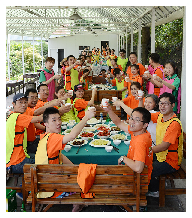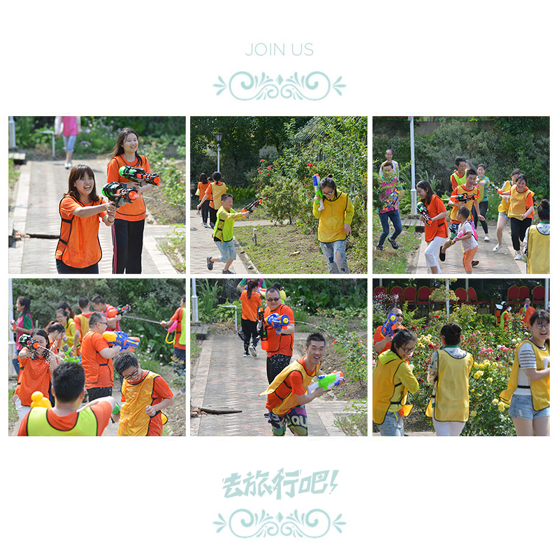 吃好午饭大家各自歇息一下,然后进入了我们下午的活动,个游戏是水枪大战,大家各自领好自己的装备,开始去装水,然后两队先躲起来,剩下两队是进攻的,激烈的战斗开始了,虽然衣服都湿透了但是大家还是不放弃还是攻打对方,看着我们的胖阿杜和胖蒲斌很搞笑,大家都围着他两攻击,全程大家玩的都很嗨,因为天气热的原因,正好这么个水枪大战大家都积极参加根本不在乎自己的衣服湿掉什么的,连我们的小朋友们都不甘示弱,跟着部队跑见人攻击,大家都玩的忘乎自我了,当然也有我们的摄影师给我们留下美好的瞬间,这个环节结束后大家开始了另一个游戏大脚板,两队两队pk把每组队员的两只脚各自绑在两个大板上,然后一二一二的一起往前走,开始的时候大家配合的都不是很好导致前行不了,后来领队的人告知大家按照一个节拍来,开始先左后右,这样的话不会乱掉,全部按照领队的节拍来可以,大家又再试了一次,都喊着一个节拍一起往前走,这次真的做到了,没有中途停下来而且一口气走到终点,大家都好厉害,做到了真正的齐心协力,趁着大家开心的劲头开始了另一个游戏抢板凳,这个很好玩,因为输了的人要去抽签,看自己抽到的会是什么题目,然后按照自己抽到的结果去做惩罚,虽然说很吃力,但是大家还是很积极的参加即使知道自己会被罚,看吧,个被罚的人是技术部的蒋瑜娟,所以剩下的人会更加小心几乎都不敢移步了盯着板凳不敢走生怕没坐到被罚,虽然胜出的只有一个,但是大家还是很开心,因为重在参与,只为过程中的开心,享受集体活动的快乐,的游戏全部结束了,大家开始收拾东西准备去采摘!