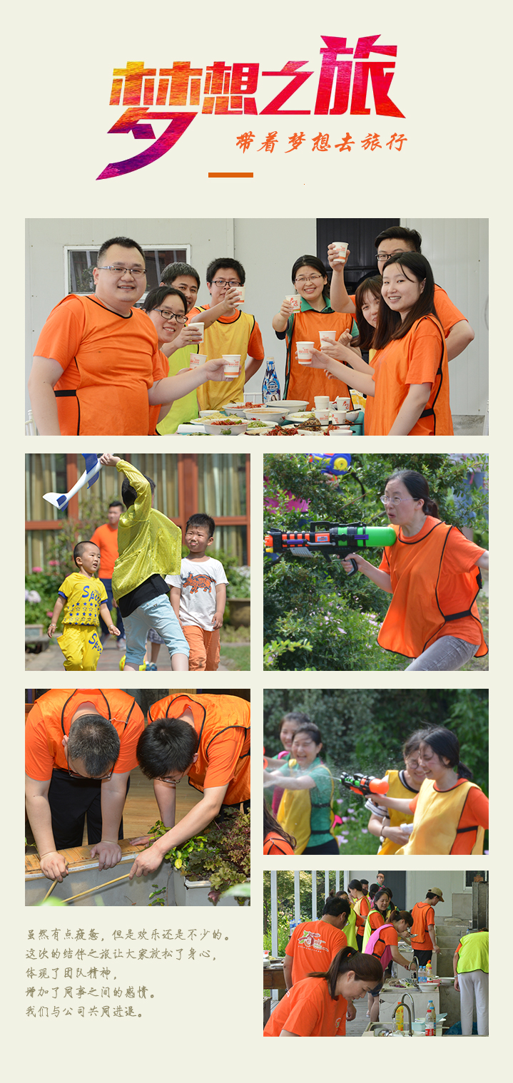 2017年6月4日,春风绵绵的日子,公司组织大家参加农家乐一日游,展开了一场户外素质拓展训练,是为了促进大家各部门的友谊。让每一位伙伴们体会到团队的力量,突破自我,坚持不懈,勇于创新。
