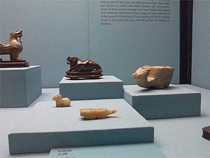 台北故宫博物院的第三层展出的是图书、字画、碑帖、玉器、雕刻和织绣。玉器展台上让人叫绝的是一棵清代的翡翠玉白菜。玉器匠人将一块半白半绿的翡翠为料,运用玉料自然色彩的分布,白色部分雕琢成菜帮,一丝一缕分明;绿色部分雕琢成白菜叶子,凹凸起伏、一收一放自然,活灵灵一棵新鲜的白菜,娇嫩欲滴,仿佛一捏会流出水来。更叫绝的是,白菜叶子上微黄的部分雕琢成两只蝈蝈,正在吃白菜,让你不敢大声喘气,生怕惊跑了它们。这棵翡翠玉白菜是清末瑾妃的陪嫁物品,放在永和宫内,白菜寓意清白,象征新娘纯洁;蝈蝈生殖力强,象征多子多福。