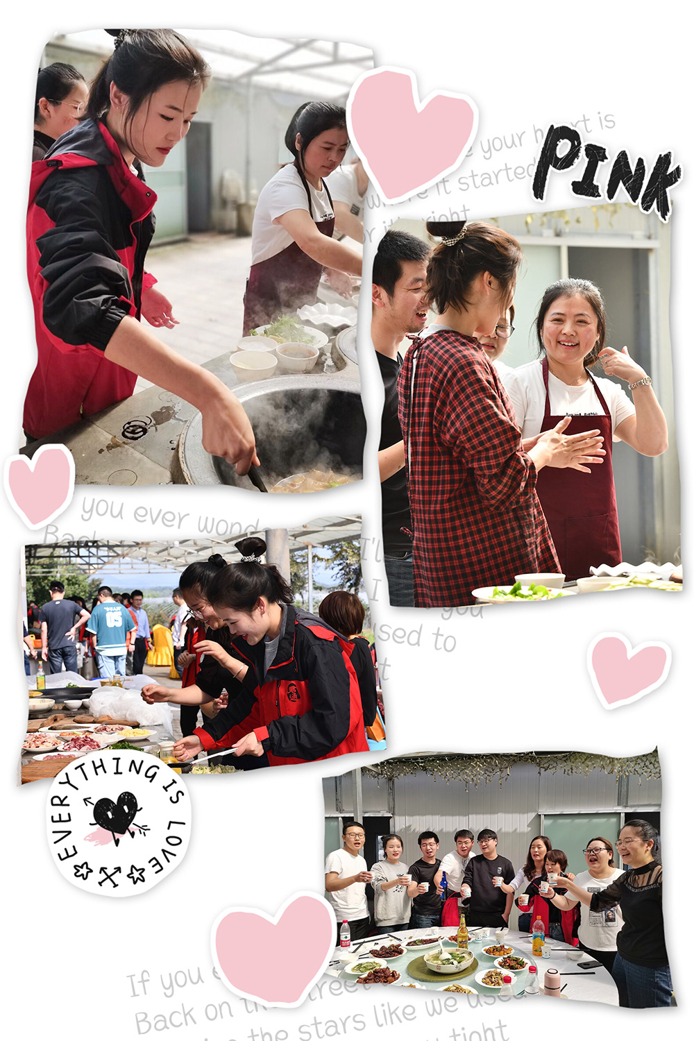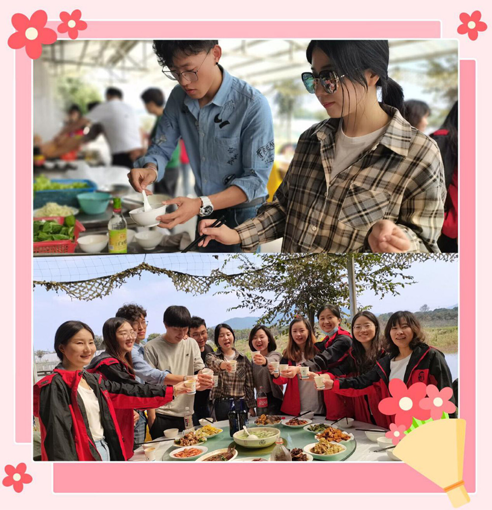 旁边,靓的风景当属我们客服商务Team,有3位帅哥的加盟、客服姑娘们忙得不亦乐乎,烧火、洗菜、协助主厨小威有节奏的进行着烹烧蒸煮俱清香, 奏响美食的音符,特别感谢市场部大哥哥大姐姐们、他们不仅工作中热情指导帮助新人成长,在我们提出帮我们一起烧几道菜时爽快答应,在他们的鼎力相助下很快我们客服也准备开饭啦: