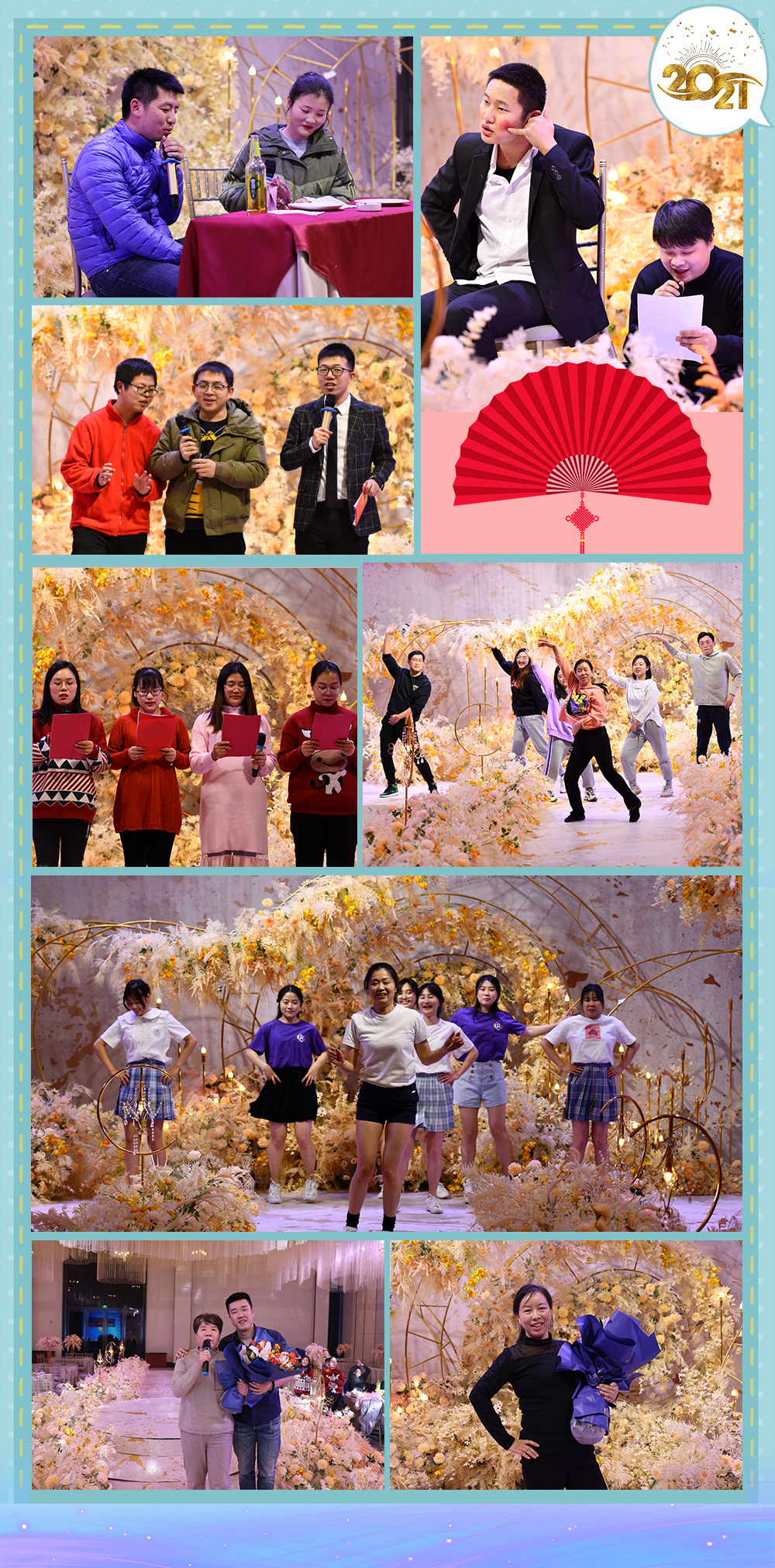 期待的时刻到来了,帅气靓丽的主持人登台,君通一年一度的春节晚会拉开了帷幕,每年的此时都是我们君通每个人的高光时刻,君通的每个人都是多才多艺的,无论是小品、舞蹈还是双簧唱歌,每个节目都精彩,看吧,首先上台的是技术部带来的歌曲《奔跑》从未登台唱歌的章哲星是首秀,台下的呼喊声就知道他的人气有多高,虽然整场都在偷看歌词,哈哈哈,个节目就把晚会的气氛一下子带动了起来,还有市场带来的哑剧小品《胶》,演绎的淋漓尽致,动作生动形象,我们的老当益壮的王经理这次的角色装扮真的是靓丽帅气,朝气蓬勃,人事行政的两位美女吴燕和吴云云带来的歌曲《Yesterday once more》声音甜美,都沉浸在了她们甜美的声音中,君通人真的太多才多艺了,接下来客服部宋世伟带来的二胡独奏《青花瓷》获得掌声不断,电销二部的仲毅、邓凤杰带来的小品《低价航空》真的是让台下的人捧腹大笑,仲毅精湛的演绎,那声音、那装扮、那逗趣的情节,实在不得不说,仲毅你是表演系毕业的吗?沈陈斌和陈晨带来的说唱节目《失恋心酸往事》也让台下的人掌声不断,技术部卢啸啸、吴青每年都给大家带来歌曲《恭喜发财 2021》,过年当然是恭祝大家恭喜发财,多多发财,每年市场都会给我们带来好看的舞蹈,当然今年也不例外,由刘红领队带领浦斌、魏嘉威、刘洁、宋亚兰、王维给大家带来的舞蹈《漫步人生路,答对了》,那舞姿、那娴熟的程度,看来是在做好业绩的前提下真的是没有少花时间去练习啊,每年都会有的双簧今年当然也不会少,电销二部的柳智明、仲毅带来的双簧《打电话》不减当年的搞笑,一度赢得台下的掌声和笑声,2020年我们经历了很多,有太多的不容易和不能够,有太多的温暖和辛酸,但是我们很庆幸我们生长在中国,我们很庆幸我们还能够欢聚一堂,《2021 中国你好 君通你好》由技术部马茹燕、蒋喻娟、顾建美、戴钰带来的诗朗诵,赢得了响亮的掌声,是啊,2020年所有的坎坷都已经过去,未来我们会向着2021更加努力的前行,在客服部的舞蹈《浪漫樱花》中结束了我们君通2021年的春节晚会,我们明年再见!