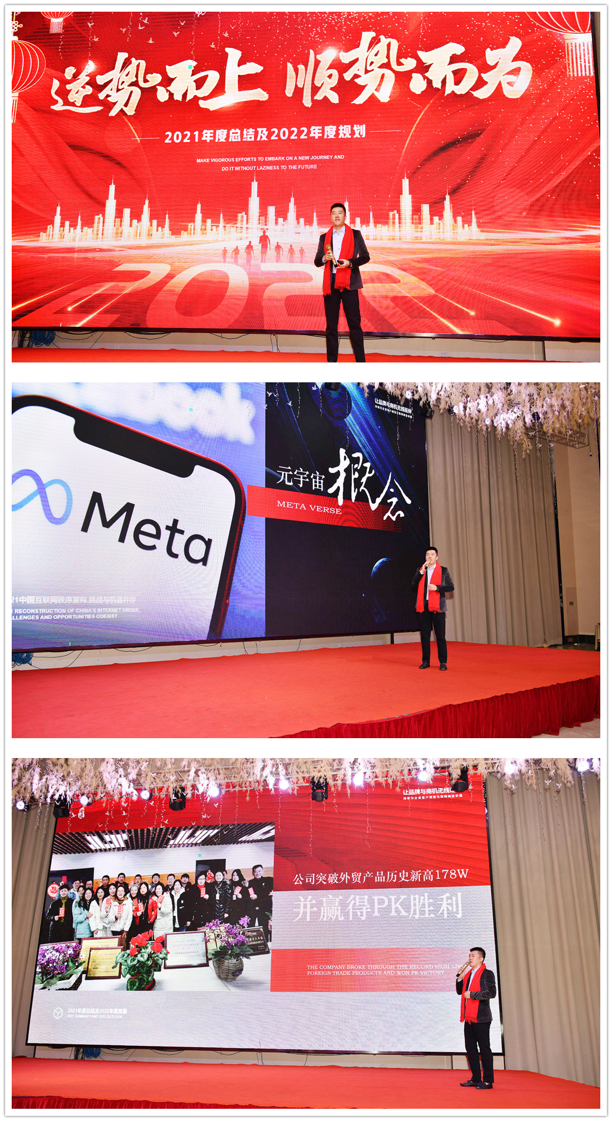 春花露笑意,爆竹添欢笑,气势恢宏的电子屏”逆势而上,顺势而为”拉开了无锡君通科技有限公司2021年度总结表彰及2022年度规划大会帷幕!回首牛年,对于我们来说给予我们太多的难忘和感动,让我们难以忘怀,过往皆序章,未来皆可盼,君通这艘互联网的诺亚方舟领航者康总及各部门职责人分别对各部门过去一年的工作都做了详细的总结和新一年的规划!